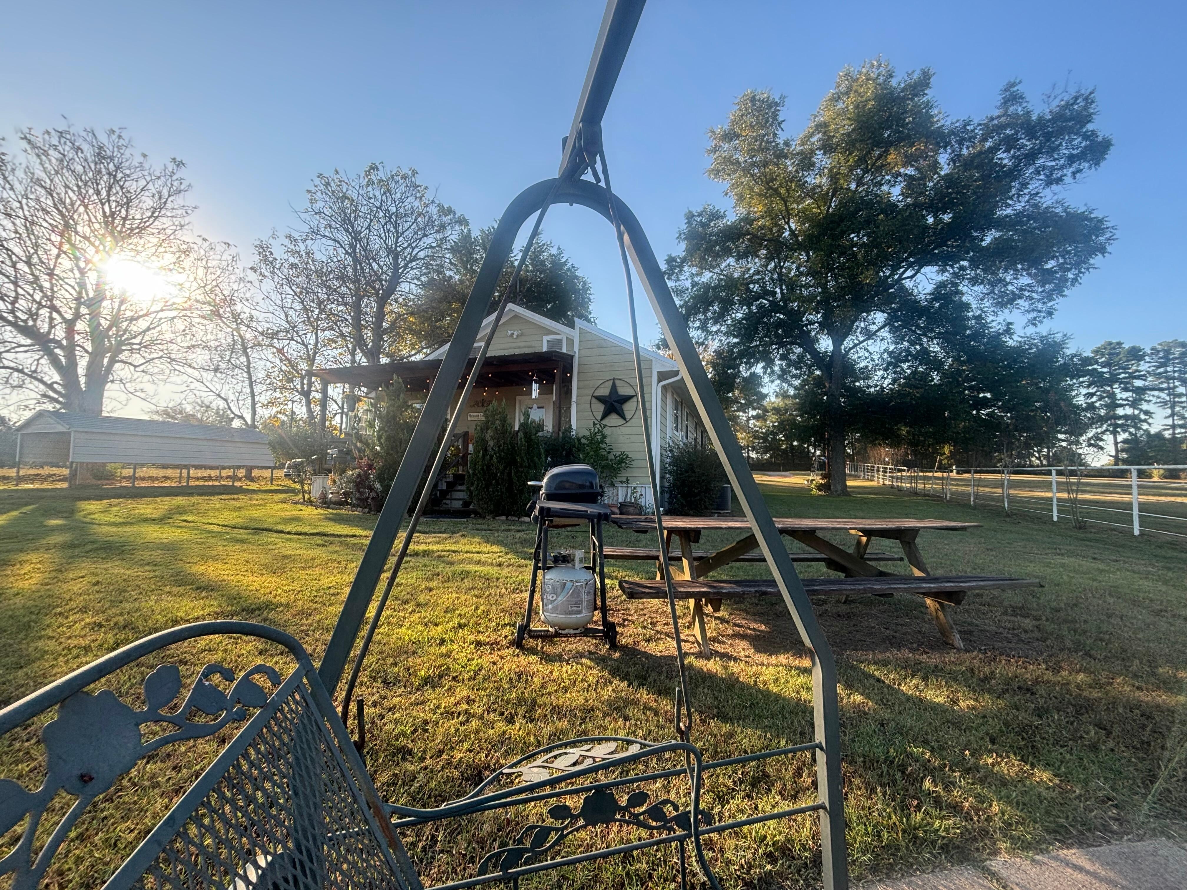 Birdie’s Place is a picturesque 1930’s farm house tucked away in the country just north of Tyler and east of Lindale. This 900 square ft. farmhouse has two bedrooms and one bath. It comes with a fully equipped kitchen, mud room and laundry. Beautifully renovated in country bling, the cottages amenities are wireless internet, satellite TV, and a 55 inch uhdtv and bluray player with surround sound. Complete with comfy porches both front and back. Sit and relax and watch our longhorns graze next door. Birdie’s has a firepit for roasting marshmallows and covered parking is provided. It is centrally located to Texas Music City venue in Lindale next to Miranda Lambert’s Pink Pistol. Just down the street is Tiger Creek animal reserve and Tyler State Park. 35 minutes to 1st Monday Canton Trade Days with 6 thousand vendors. Close to antique shopping in Mineola and Gladewater. Just south in Tyler is the Rose Gardens and convention center, Tyler is known world wide for it’s beautiful roses. The historic Azalea Trails district in the spring is a must see.