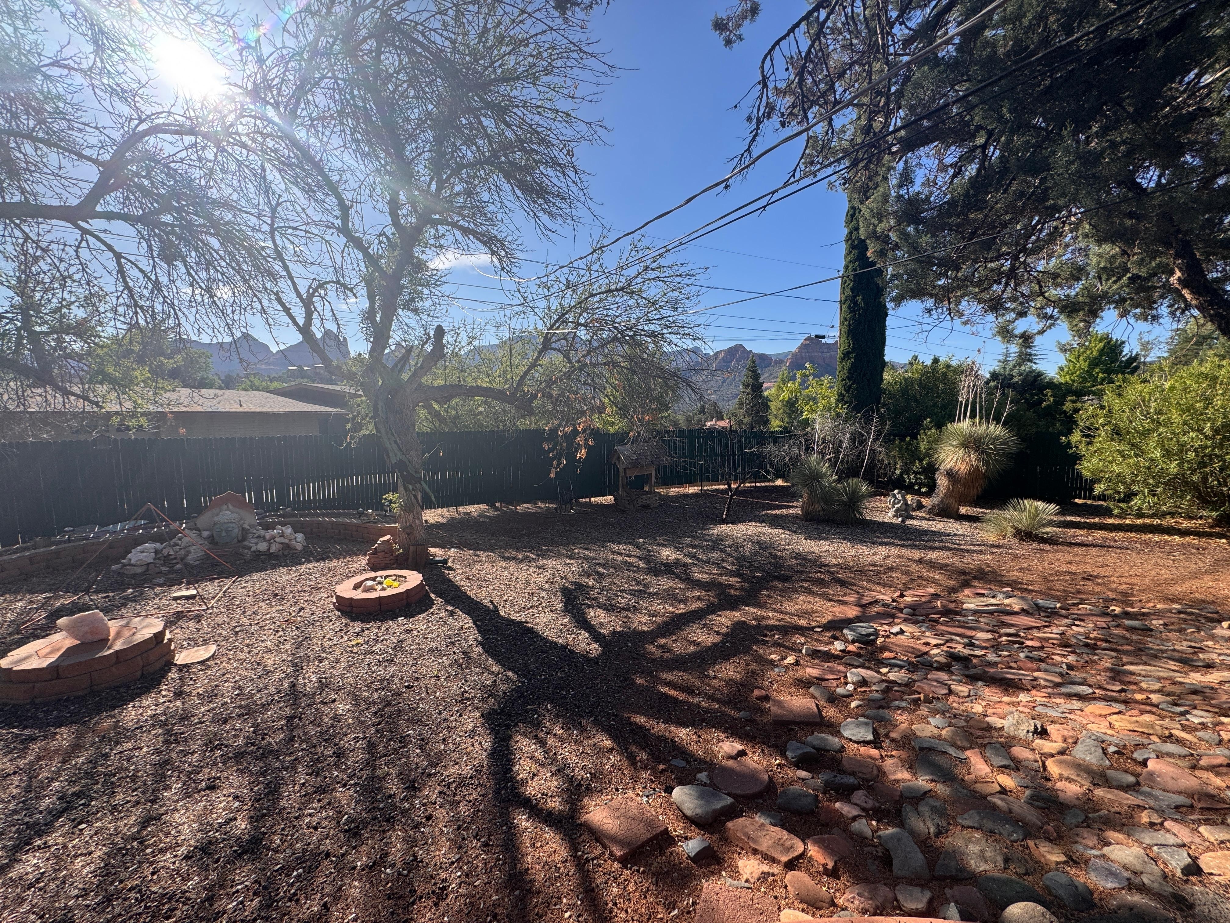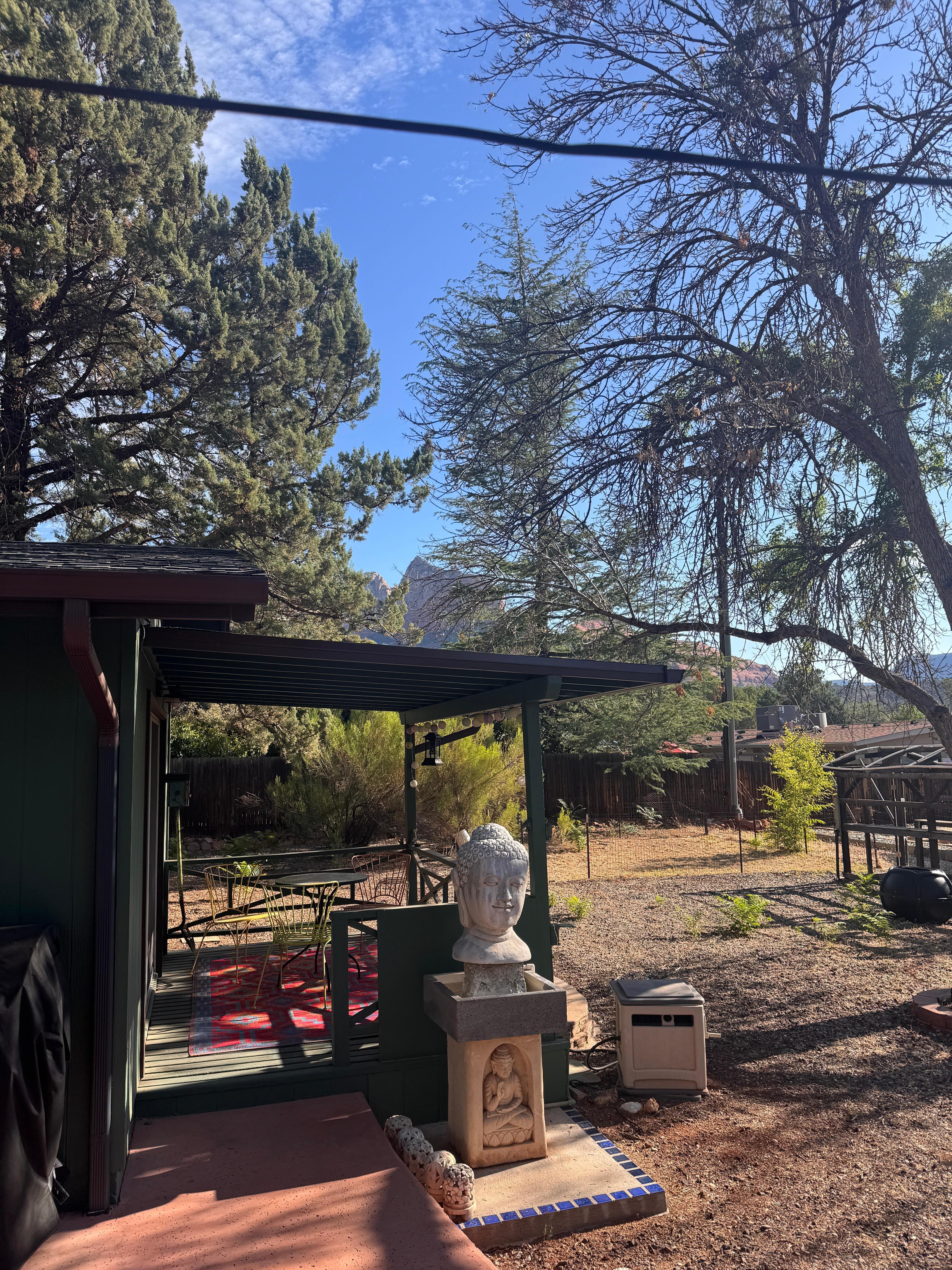 This Sedona Retreat is a 3 Bedroom 2 Bath home within a 2 minute walk- (0.1 Mile from City Center) distance to the Historic UpTown shopping district, great restaurants (Cowboy Club and Pink Jeeps) and shops and just blocks away from several of Sedona's beautiful hiking trails. Oak Creek Canyon is just up the road, and you are exactly 2 hours from the Grand Canyon. The back yard is fenced and contains BarBQ, outdoor seating, a gorgeous Buddha (fountain has been filled in) , and beautiful views of Sedona's Red Rocks. Enjoy a family Bar-B-Q or just a cup of coffee on the patio, and if you happen to be here in Summer, you can eat peaches off the tree in the back yard.