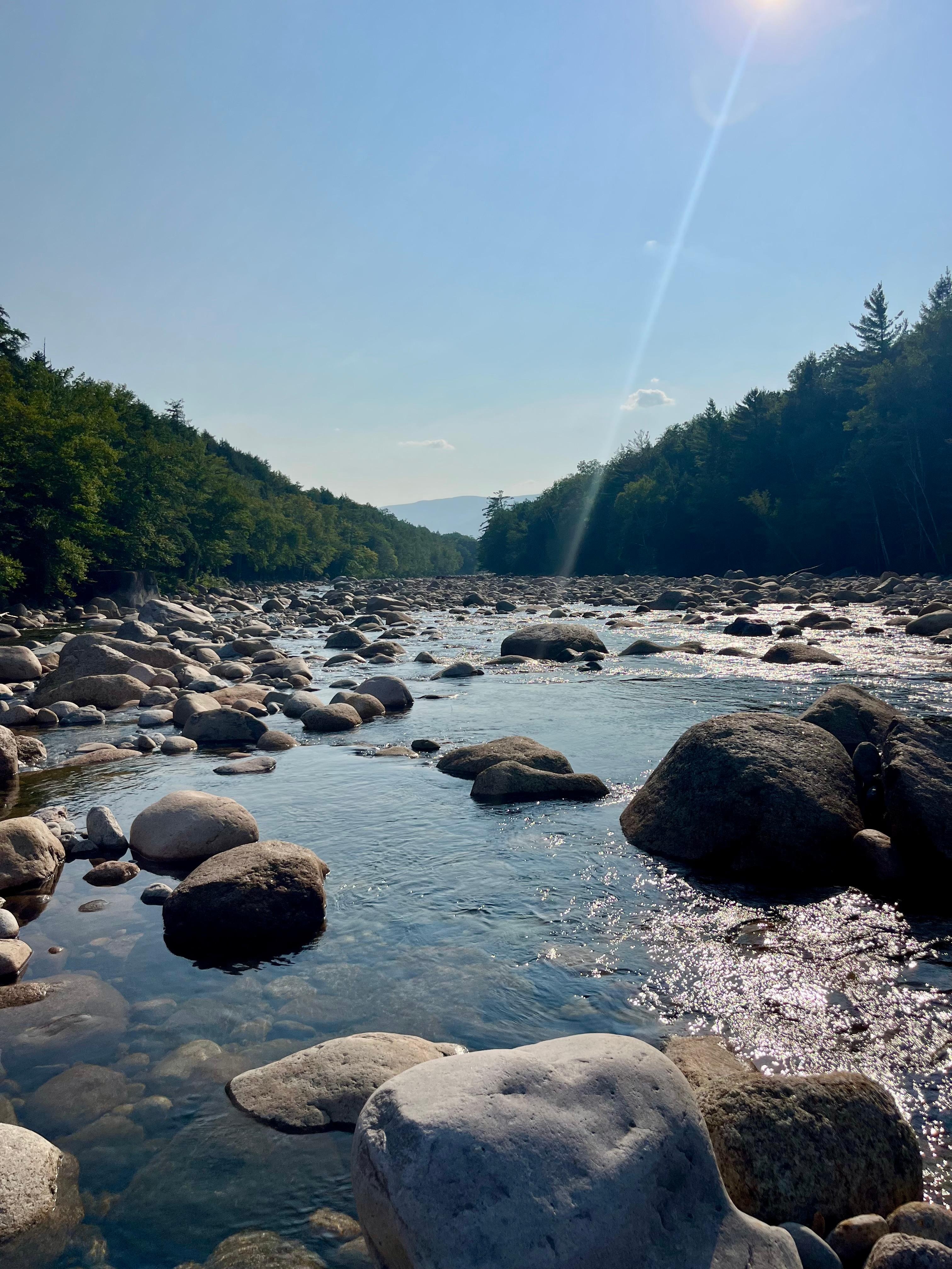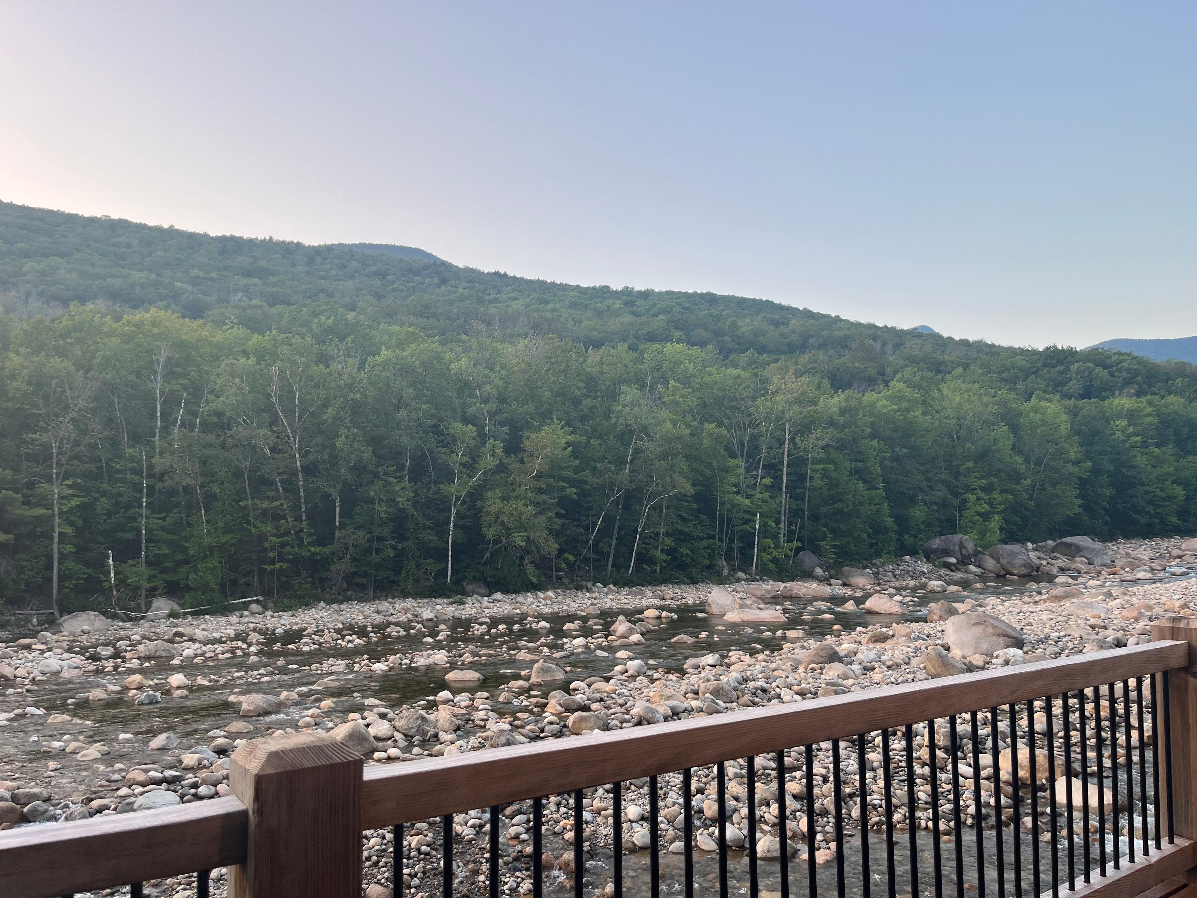 Outdoor space: Large stone patio with fire pit and seating on the riverbank. Large wrap-around deck with grill, seating/dining options, and gorgeous views of the Pemigewasset River. There is an outdoor dining table that seats 6 and a high-top dining table that seats 4. The deck has stairs from the living room/kitchen level of the house going down to the fire pit and river.