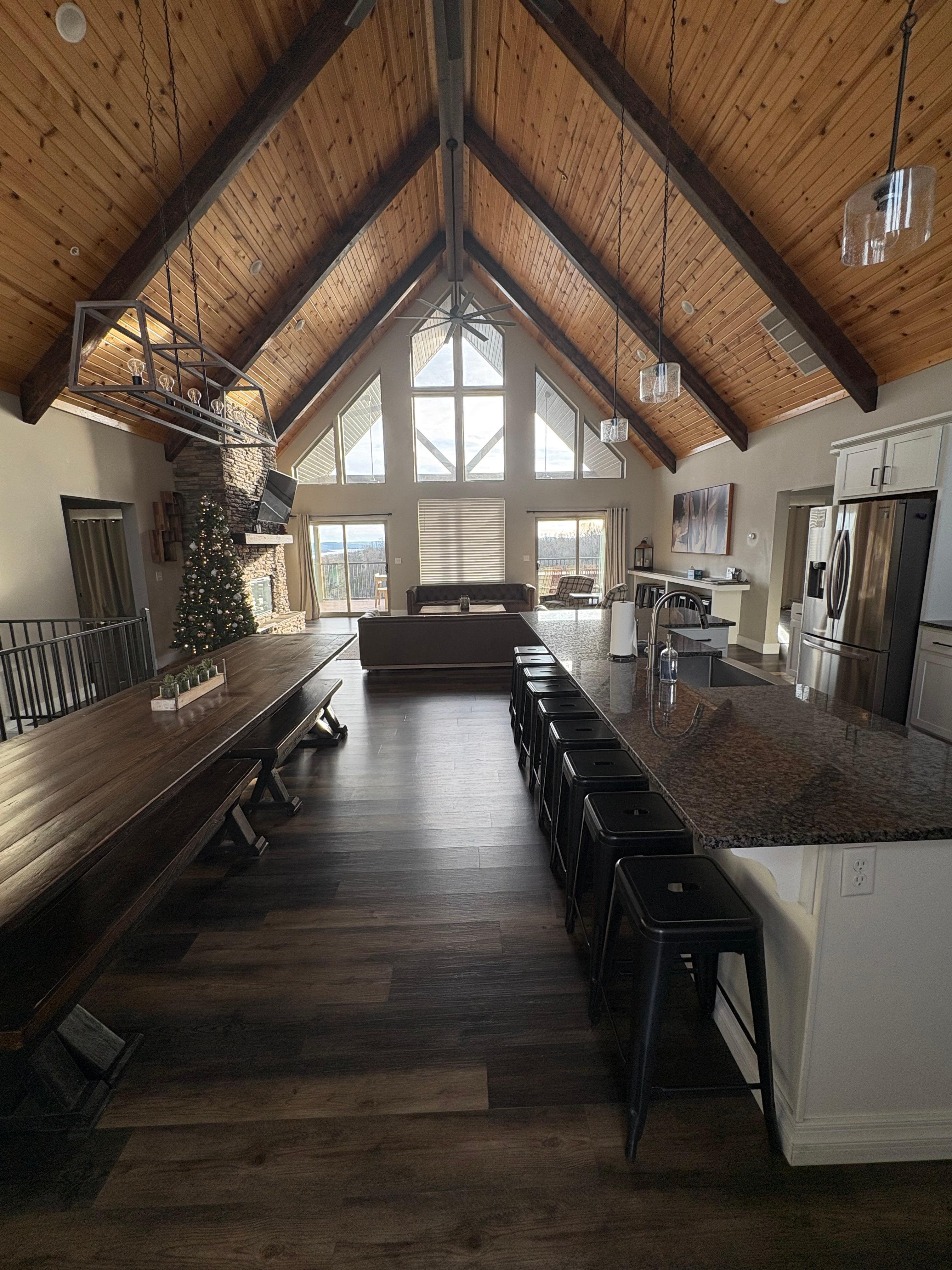 Lakeview Timbers awaits your next family reunion, wedding party, vacation or any other group ready to be treated to comfort and style surrounded by the beautiful Ozark mountains above Table Rock Lake. This lodge was designed to entertain and packs a punch when it comes to amenities! Whether it's enjoying a meal together with seating for up to 34 people overlooking the lake or spending time in our lower-level rec room stocked with entertainment including shuffleboard, pool table, standup arcade game, foosball or PS4 - there is something for everyone. Soak in the incredible scenery from our hot tub on the deck or enjoy an evening grill out! For our summer guests, opt to relax poolside with the family in the nearby Crowne View Development pool area or rent a pontoon to enjoy a lake day on Table Rock just a few minutes away at Indian Point Marina. You'll be anything but bored at this fully loaded lodge!