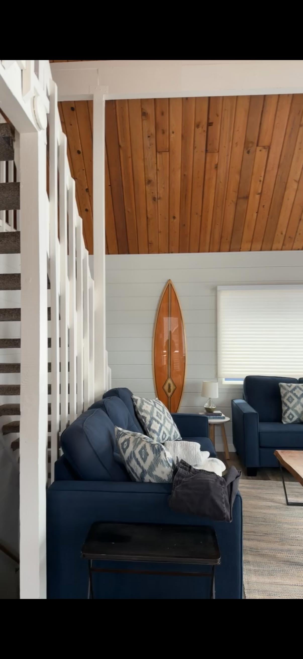 Downstairs den includes a comfy futon couch that folds in to a bed for two, a rack to store your surfboards, and a two person arcade table with 60 retro games.