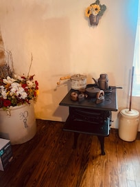 The cabin is very private and has been comfortably furnished with accented antiques. It consists of two bedrooms (one king bed and one queen bed), a large living area, a classic country kitchen, dining room, two bathrooms (both with clawfoot bathtub and one with an additional shower), porch with barbecue grill and gas fireplace.