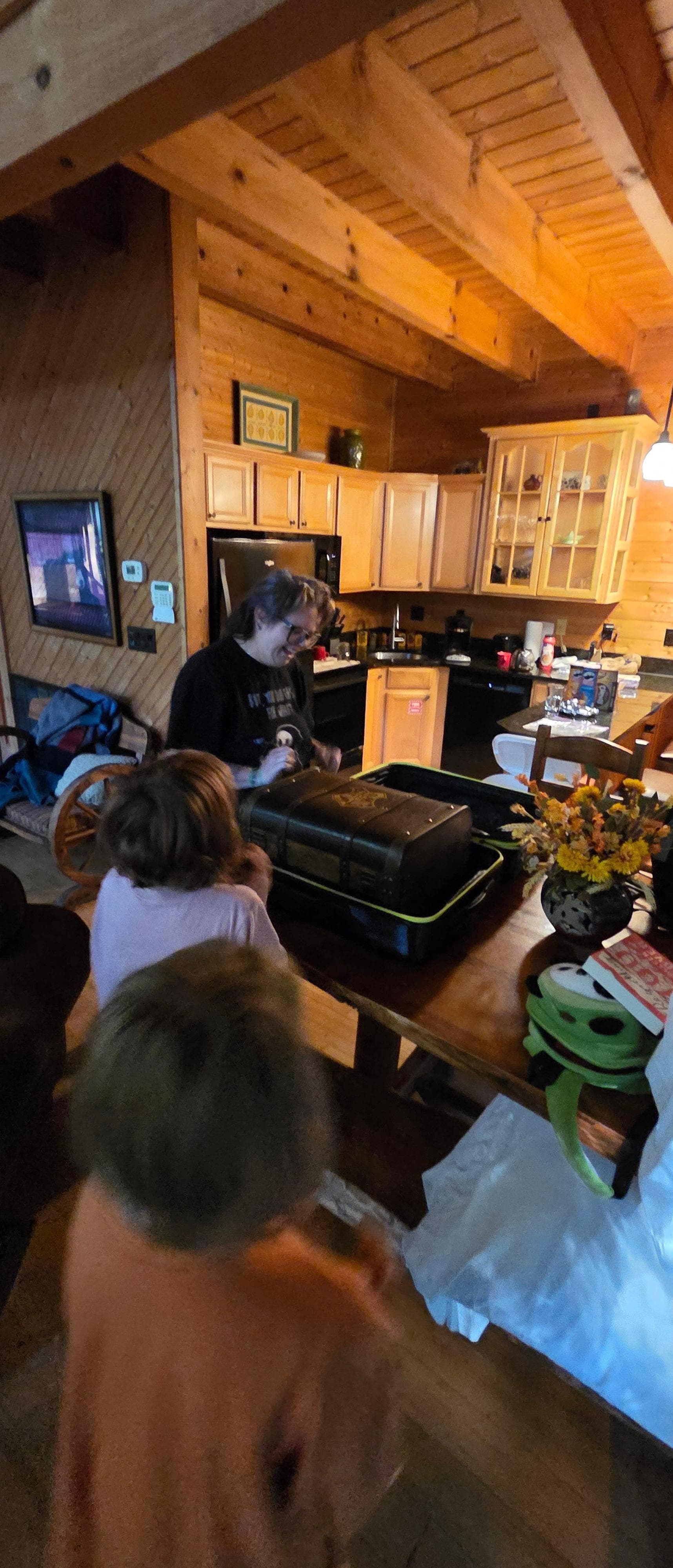 Inside Dreams & Streams, the cozy living room is outfitted with comfortable furnishings and soft lighting, perfect for movie nights or fireside chats. The staircase leading to the upper rooms offers a picturesque backdrop, ideal for group photos and gatherings. The well-appointed kitchen provides ample space and all necessary amenities, from coffee makers to deep fryers, ensuring you can prepare meals with ease. The dining area boasts scenic views, enhancing every mealtime experience.