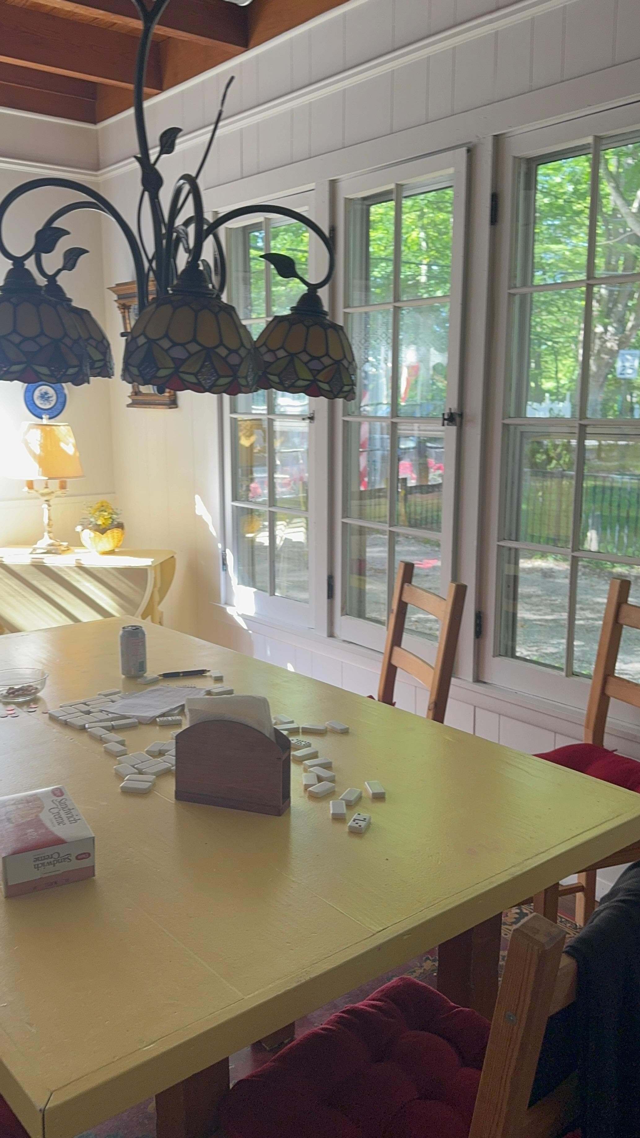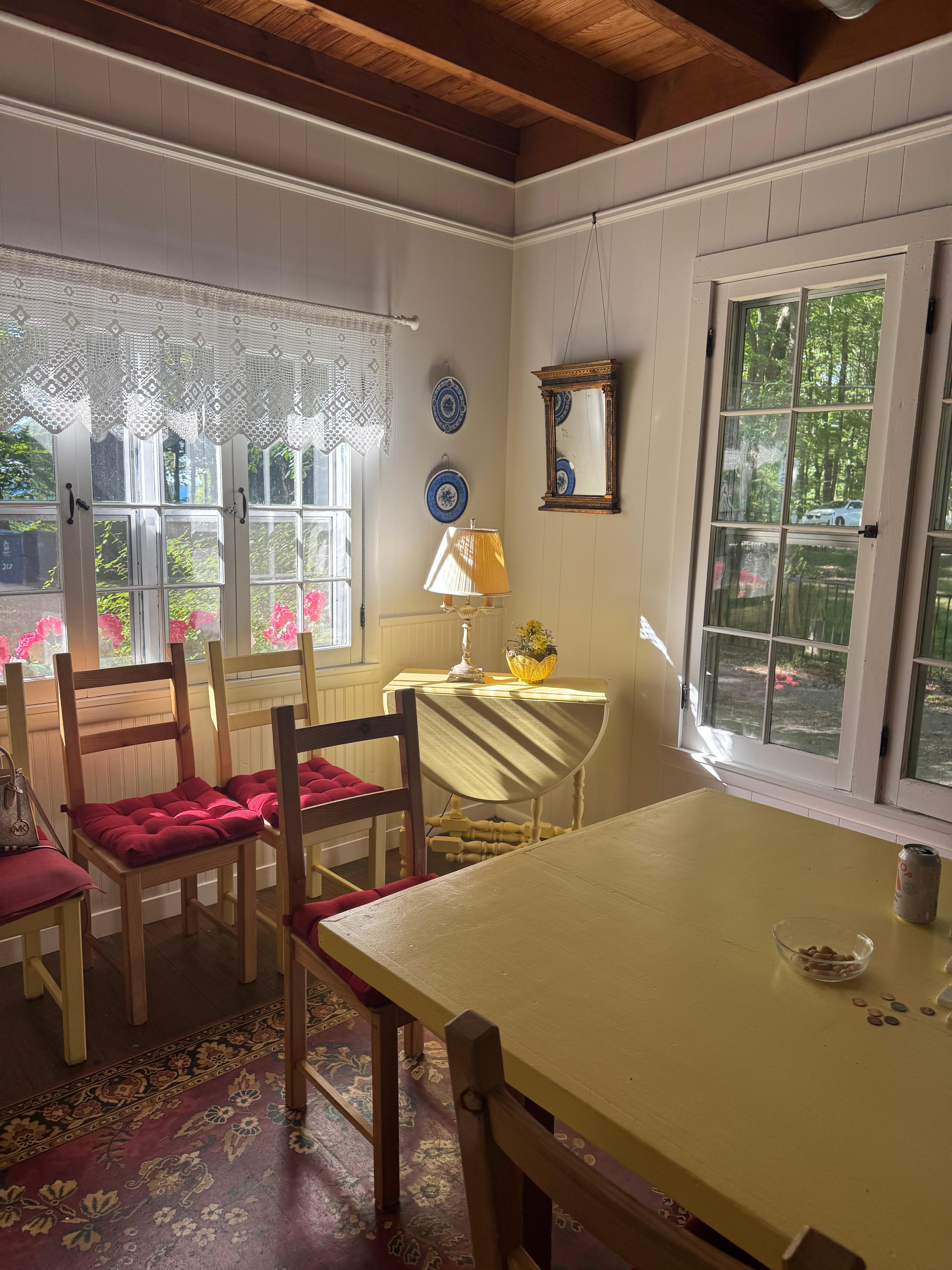 My family spent a week at the Tea Room Cottage and had a great time! The cottage was cozy but had plenty of room to fit all of us. We loved using the screened in porch for reading and back porch for having meals. The dining room table was also big enough for us to make a puzzle and play card games. The shared beach is just a short walk down the road and was big enough for multiple families to enjoy the lake. The shoreline is a bit rocky but we made due with water shoes and once you get past the rocks the bottom becomes sandy.