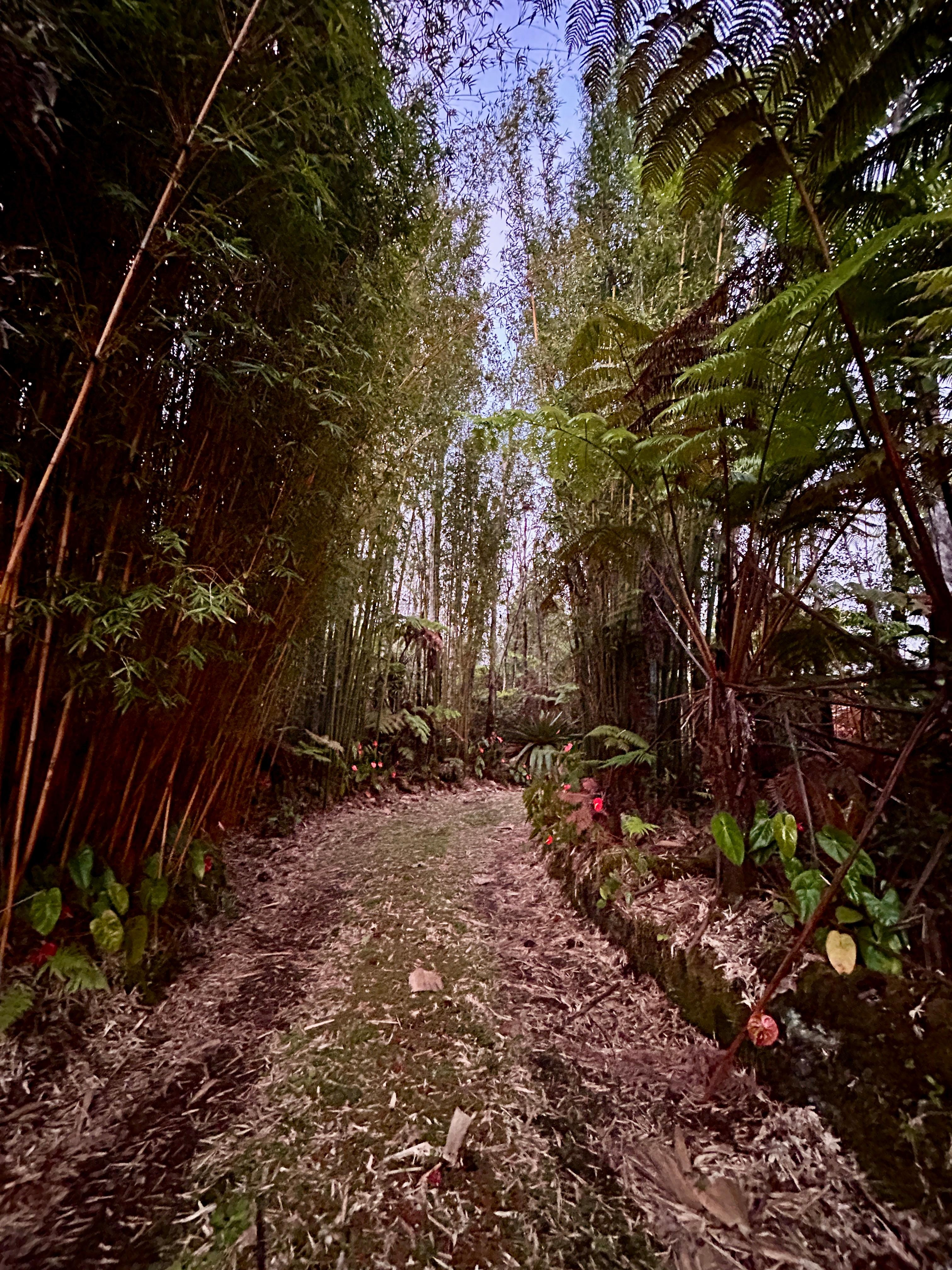 Minutes from Hawaii Volcano National Park, Bamboo View Cottage is nestled in the tree tops with views overlooking the beautiful landscrape of a 9 acre estate. . The Bamboo View Cottage is a freestanding private large upstairs (24x24) studio cottage that has a kitchenette,(complete with frig. ,apartment size stove, microwave, , 1 king bed , futon couch, dining area, bathroom with shower ,sitting area, has its own driveway, fenced yard , totally enclosed patio with bamboo fencing and sauna with front entrance faces the rain forest. You area is on a quarter acre shared by no one. ( Downstairs is a storage area you do not see.). The Studio has just been renovated to a contemporary Hawaiian style with oil paintings, fresh cut tropical flower arrangements.