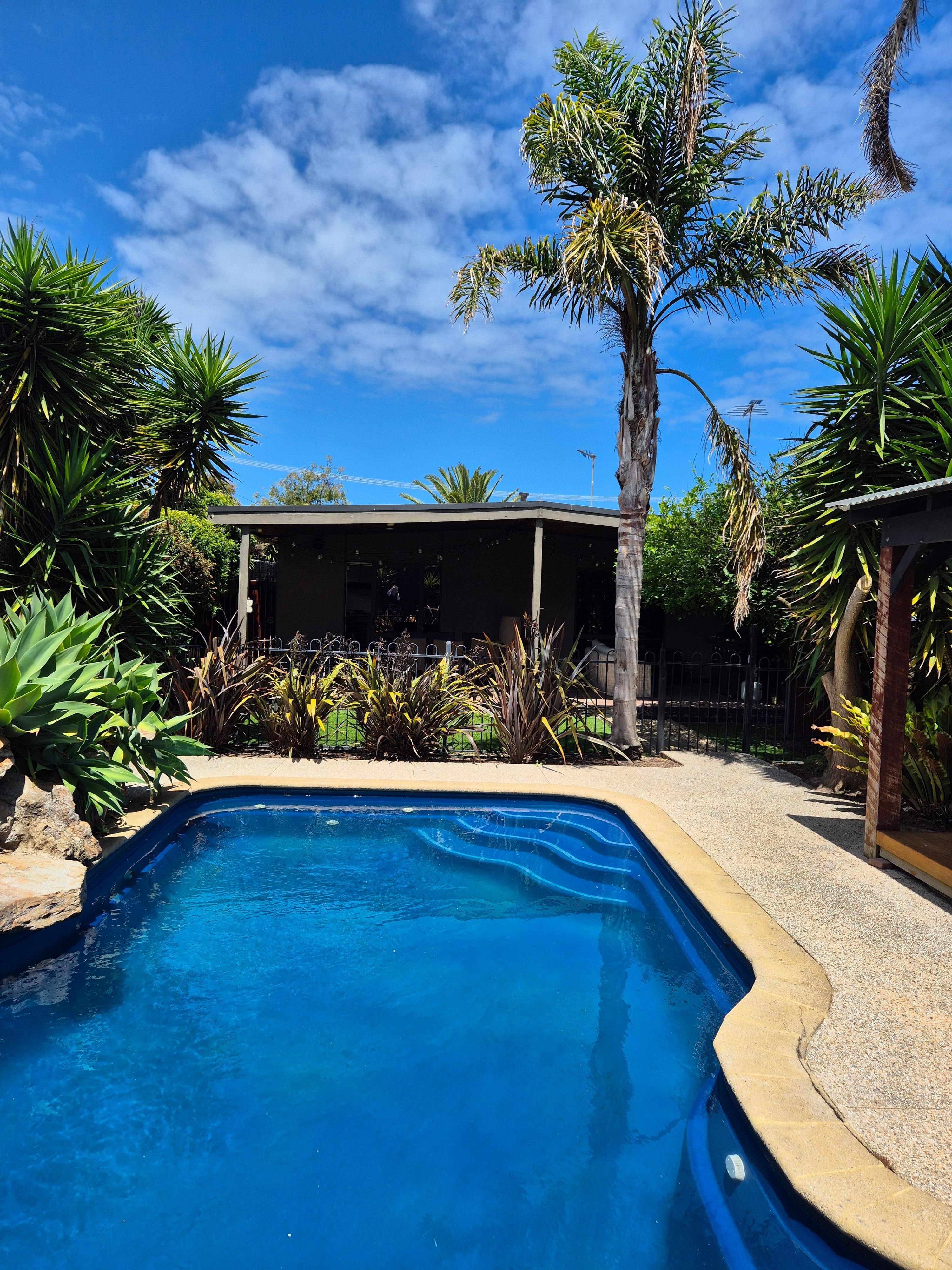 This low maintenance holiday home, set behind a tall front fence, gives you privacy in a quiet street. The property features a solar heated swimming pool set in a landscaped garden. You can relax and unwind in your own private outdoor undercover area with BBQ and dining table and overhanging fairy lights, overlooking the pool.