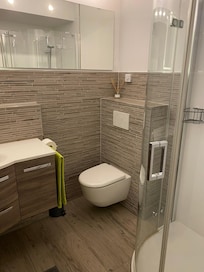 The bedroom has a big new bed and a separate dressing room, where also suitcases can be easily stored.