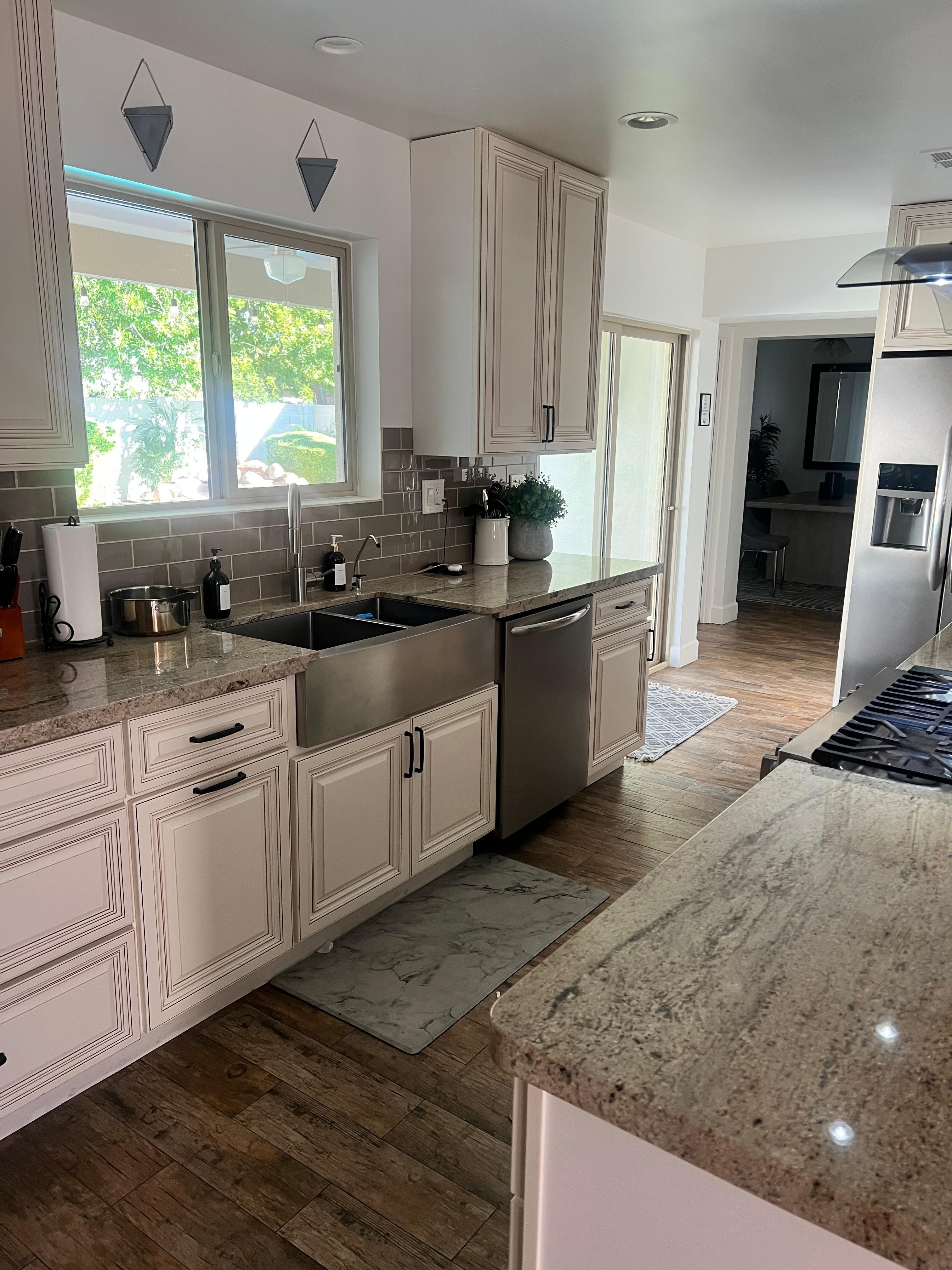 Granite countertops and a stunning stainless steel farm sink