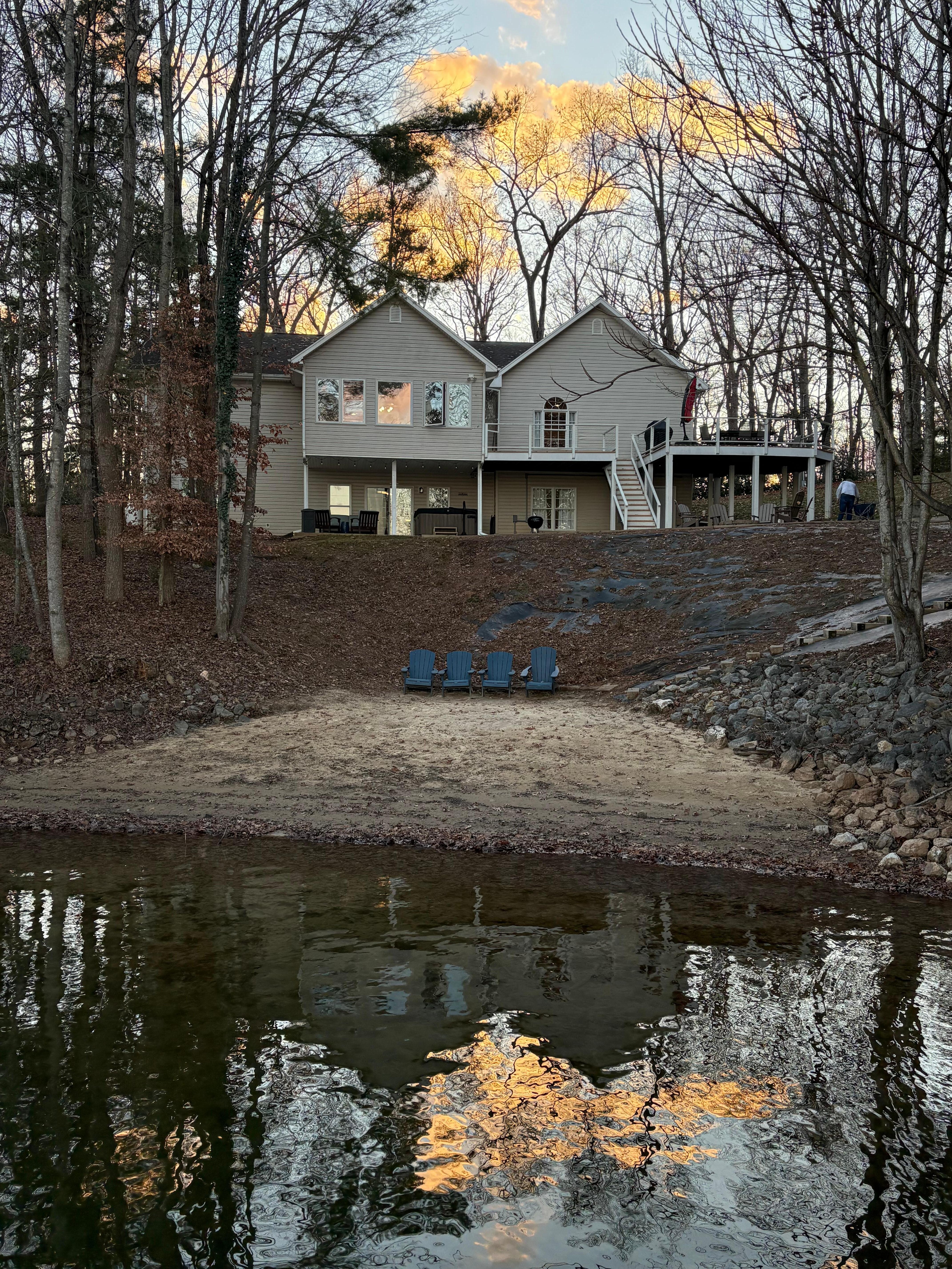 Lakeside fire-pit - walkway leading to protected sandy beach and dock where you'll have access to the covered boat slip, hoist (4000lb max, V-Hull), floating dock, electricity and lights. 2 kayaks & a paddleboard available for use.