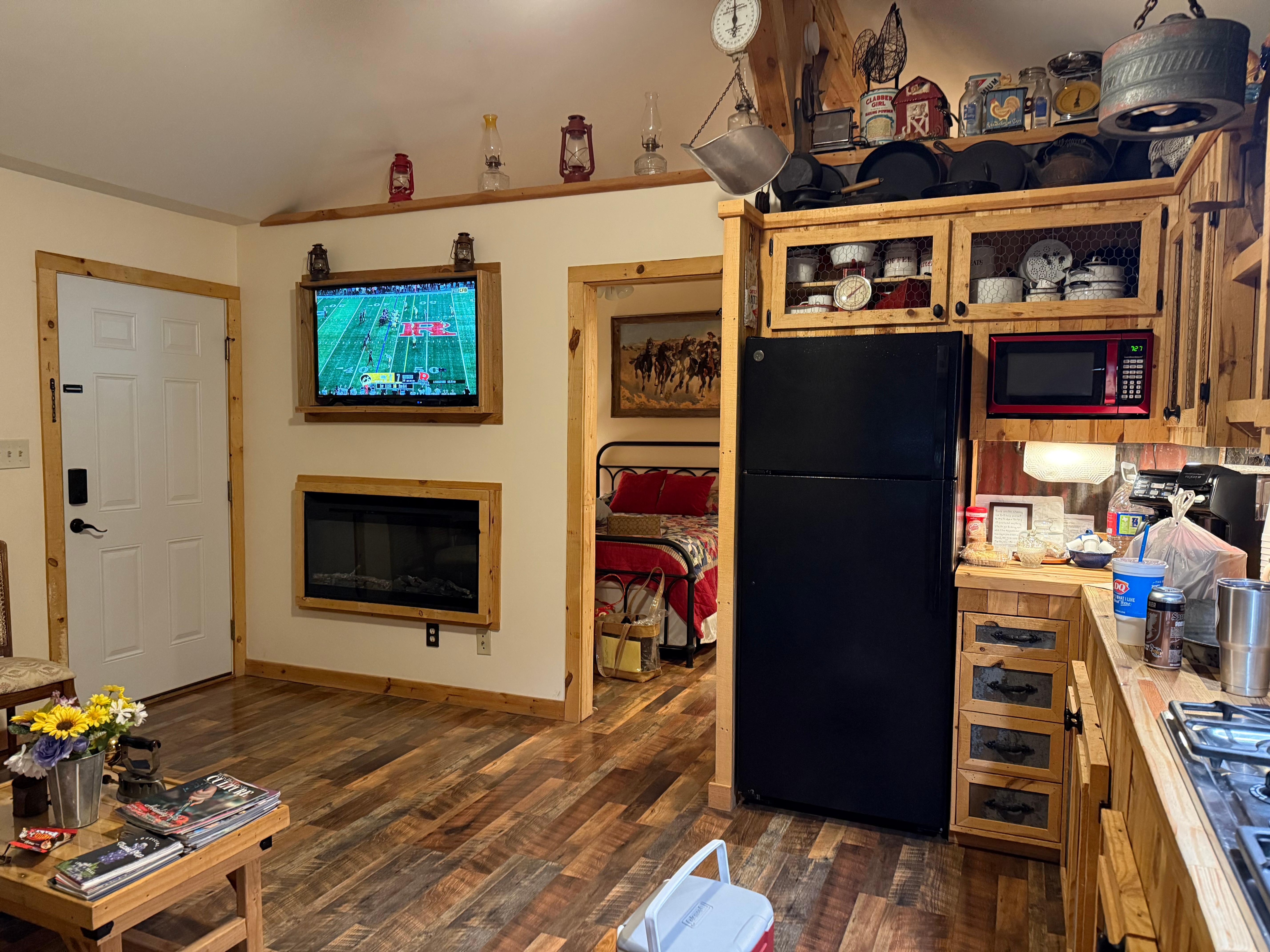 INDOOR LIVING: Smart TV, fireplace, dining table, ceiling fans, hardwood floors