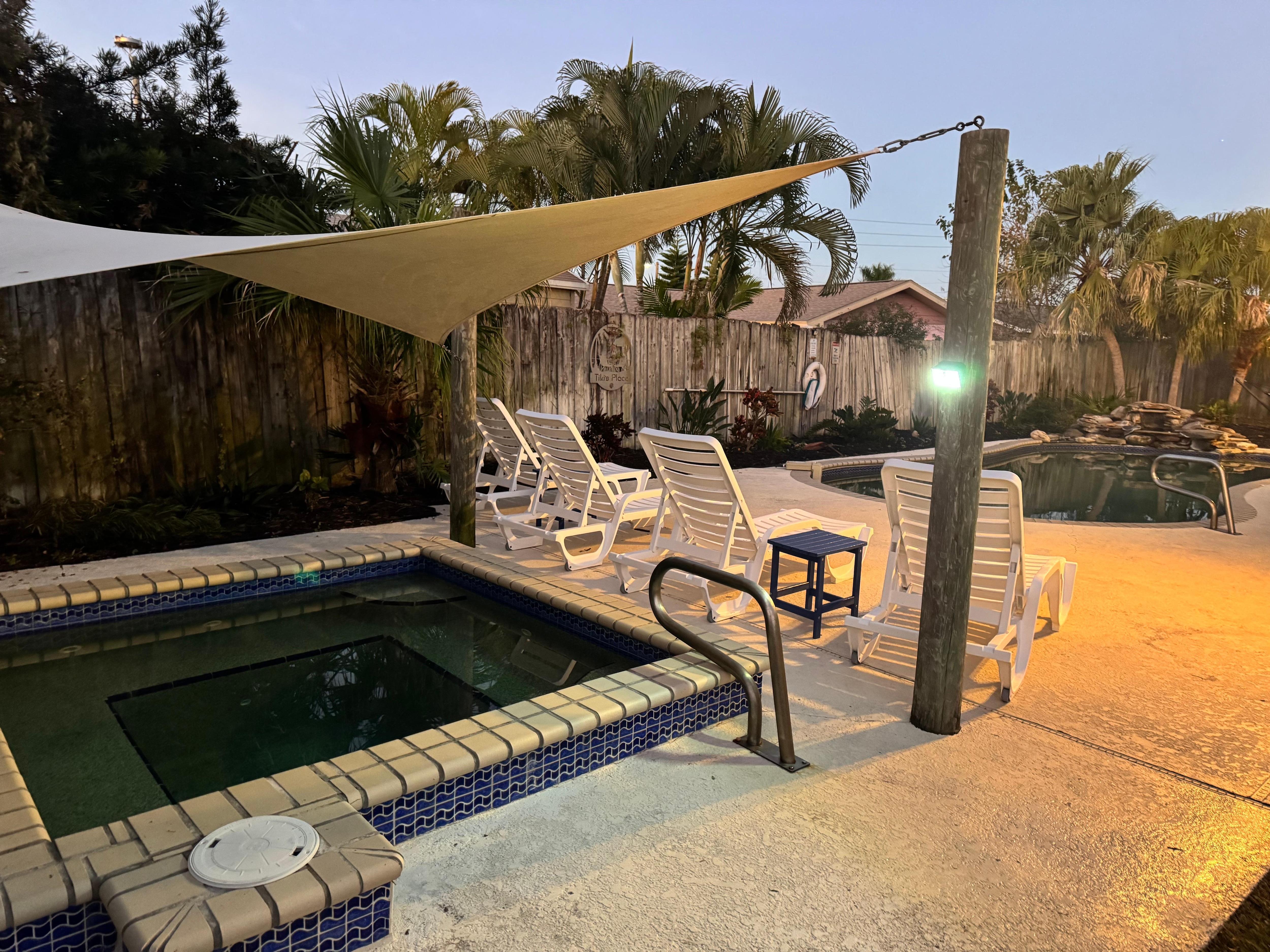 OUTDOOR LIVING: Private heated pool w/ waterfall (depth 3'-8'), covered hot tub, hammock, gas grill, beach towels, lounge chairs, yard games, covered patio, screened-in front porch