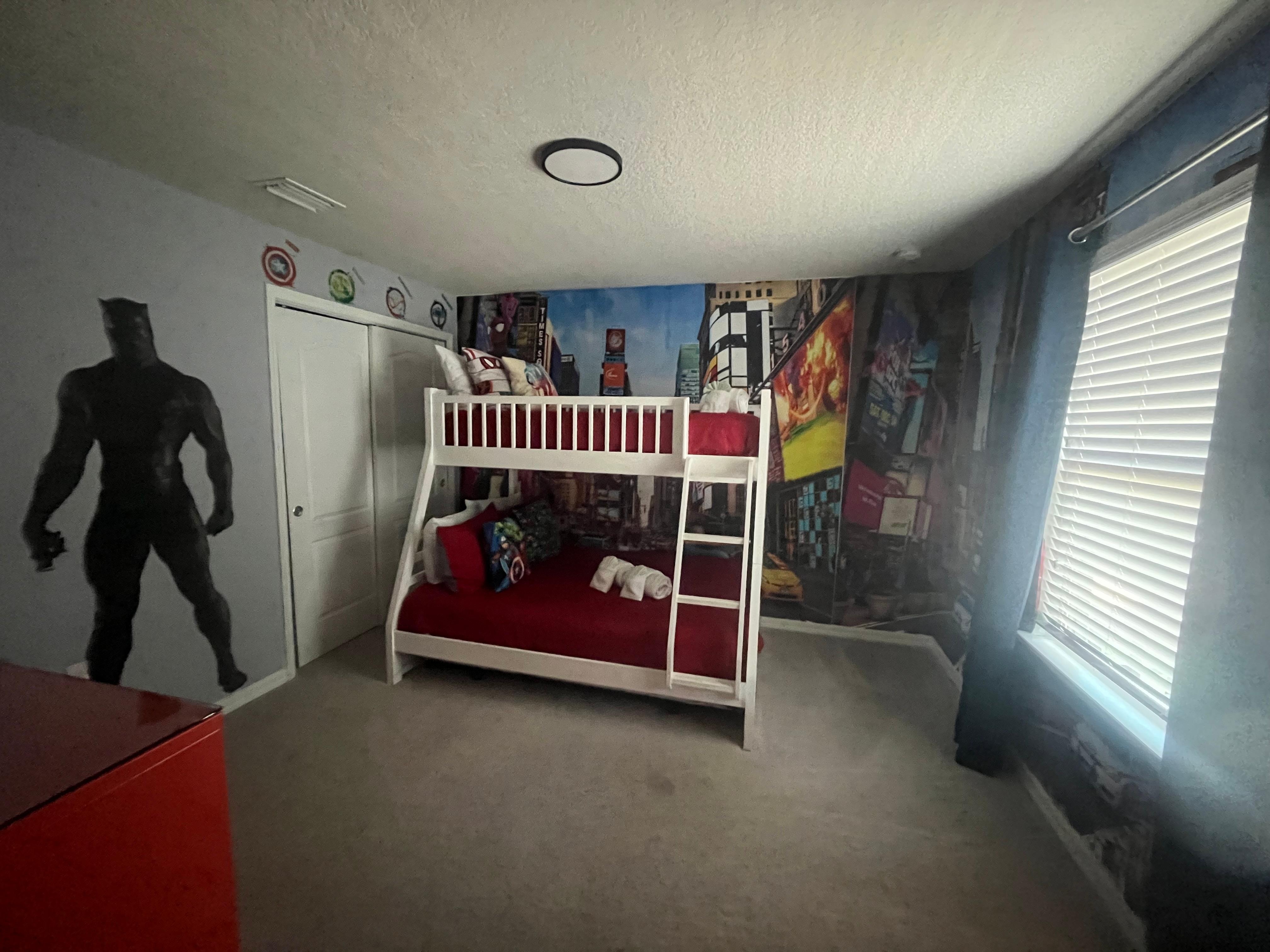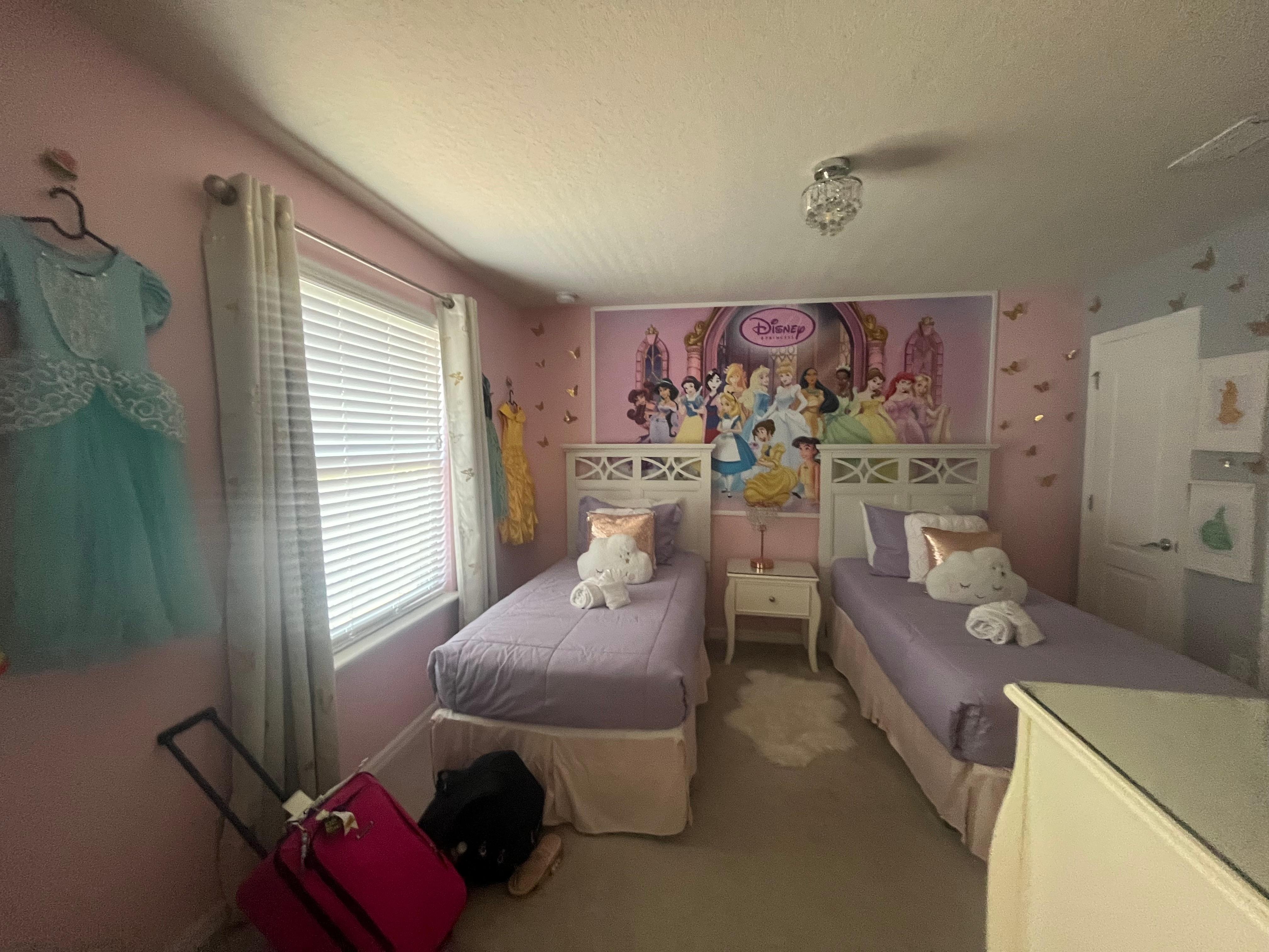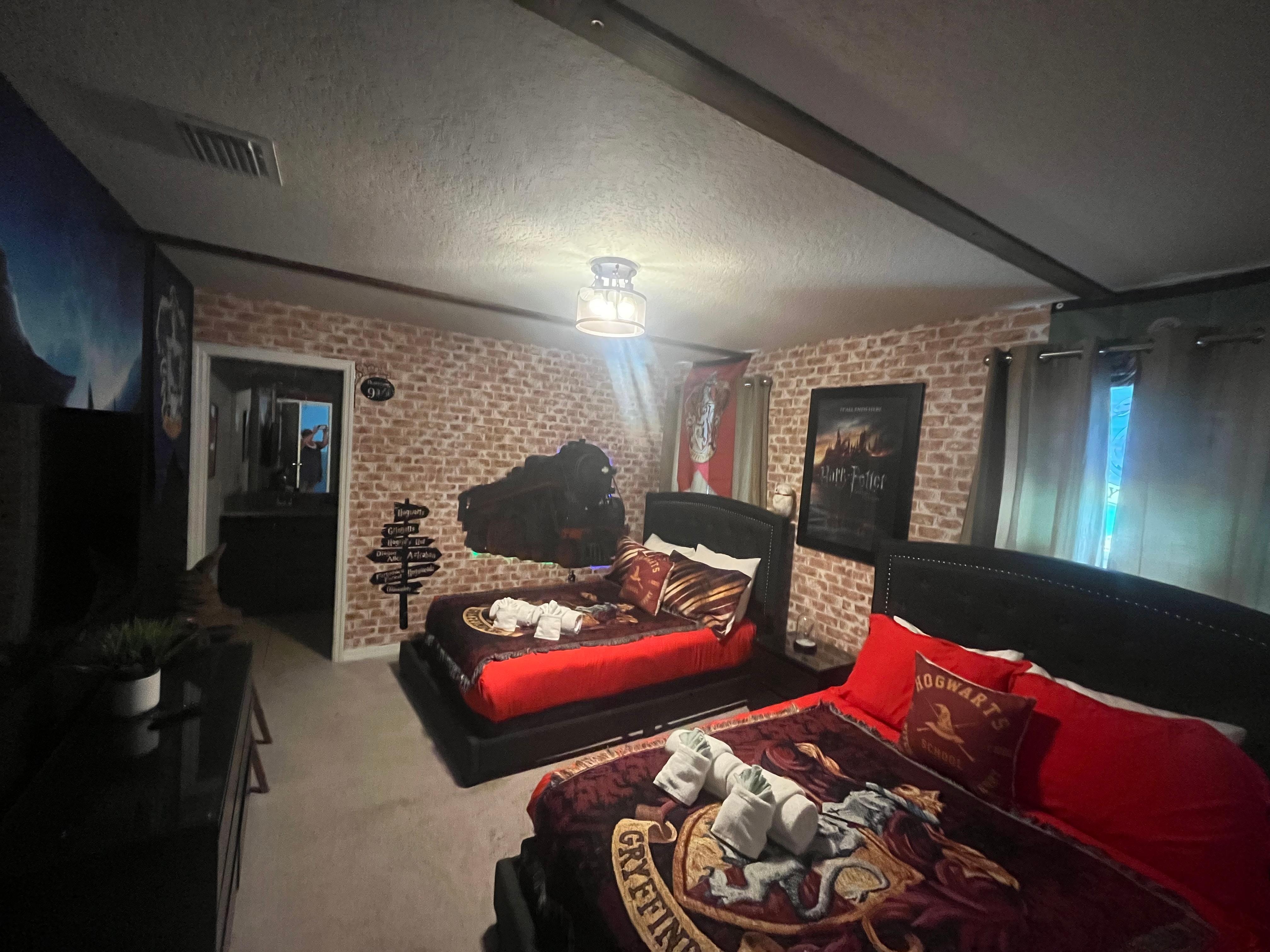 Bedrooms: 8 Total. 1st FLOOR: Master Suite w/ King; 2nd Suite w/ King. 2nd FLOOR: Suite w/ King; 2 Bedrooms w/ Kings; 1 Princess Themed w/ 2 Twins; 1 Avengers Themed w/ Bunk Bed (double on bottom, twin on top); 1 Harry Potter Themed w/ 2 Doubles. SLEEPS 16 MAX.