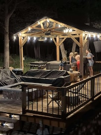 OUTDOOR LIVING: Furnished wraparound deck, outdoor TV, gas grill, gas fire pit table, deck w/ gazebo, gas fire pit, & hot tub