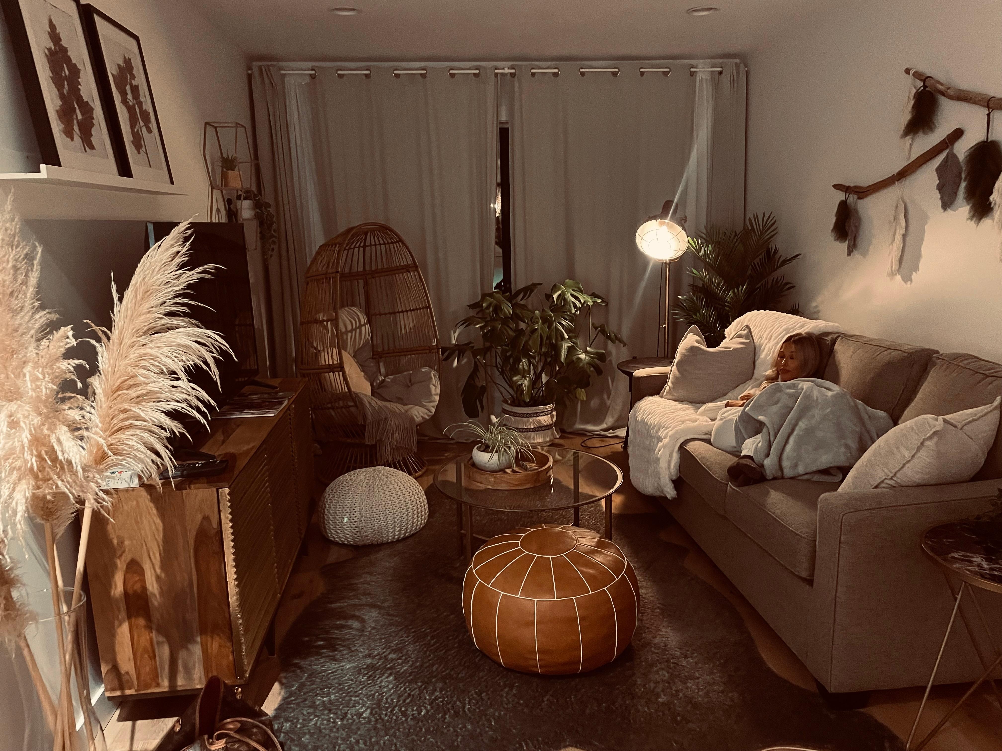 In the living room, the couch doubles as a queen sofa bed with memory foam mattress. The natural light and egg-shaped wicker swivel chair give you a place to read, birdwatch, or see the squirrels play in the evergreens. An LG 44’ Smart TV is perfect for movie night, catching up on your favorite shows, or just relaxing.