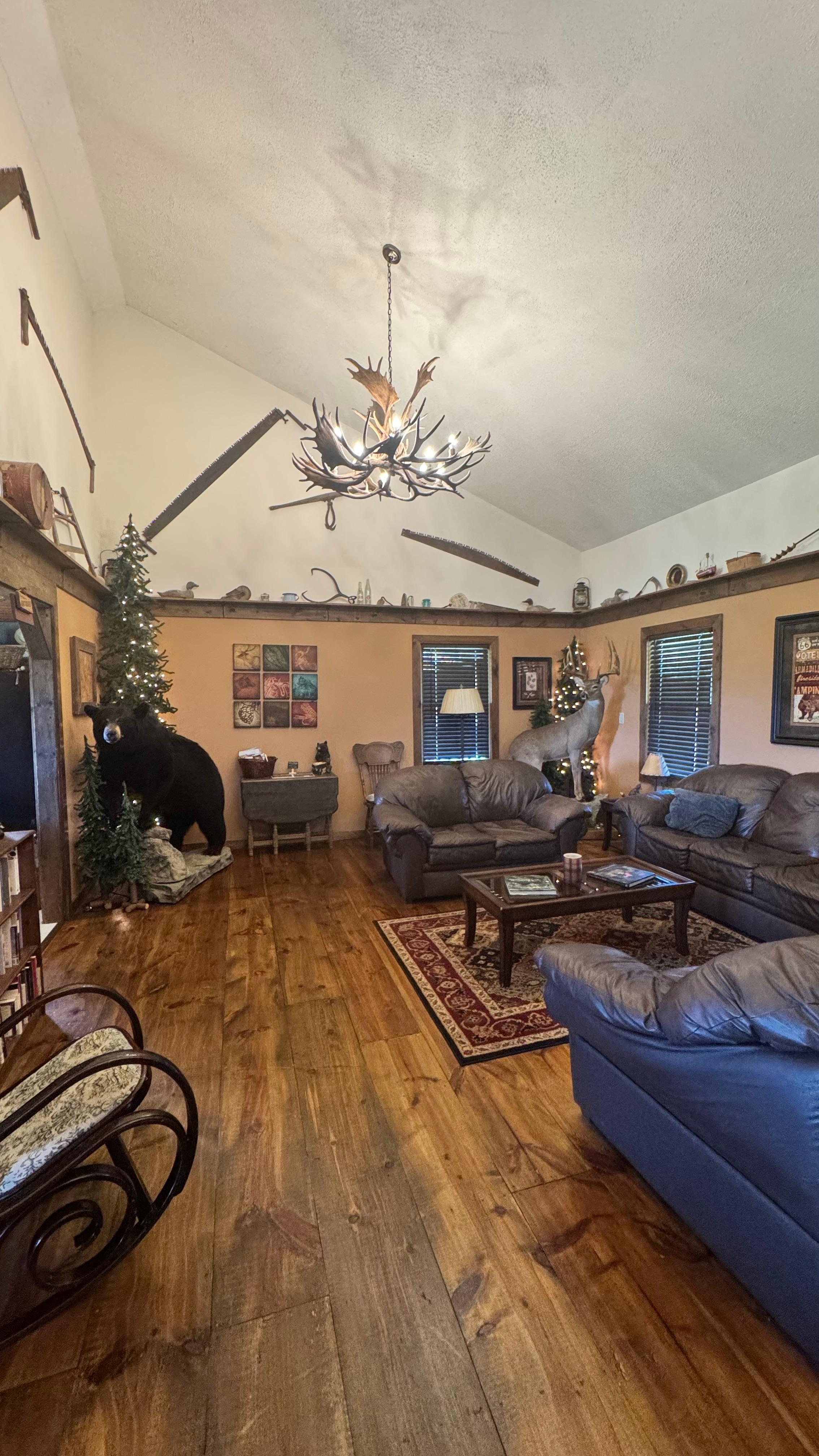 This beautiful, lodge-style home on over 40 private acres offers a breathtaking view of Virginia's magnificent Blue Ridge Mountains, and is situated smack in the middle of many of Virginia's most visited attractions. The house, full of beautifully mounted wildlife such as deer, bear, elk and more, boasts 5 bedrooms and 4.5 baths. The two and a half story, 4,400 sq ft home features 2 spiral staircases, one to an open loft overlooking the living room, and the second to a charming, private reading nook over the master bedroom suite. There is a spacious formal living room, along with a sunken fireplace room on the main level of the house, both furnished in comfortable, cozy decor. A true country kitchen houses the farmhouse dining table with easy seating for 10. There are additional tables and chairs downstairs in the generous family room which can be used for additional dining space. A large theater area for group viewing offers a 64" screen, and a game area for family fun boasts games, puzzles, Foosball table and a checkers/chess table. Four of the 5 bedrooms boast electric fireplaces, and the main level bedrooms include flat-screen TVs of their own. (Click 'more details' below to read all of description)