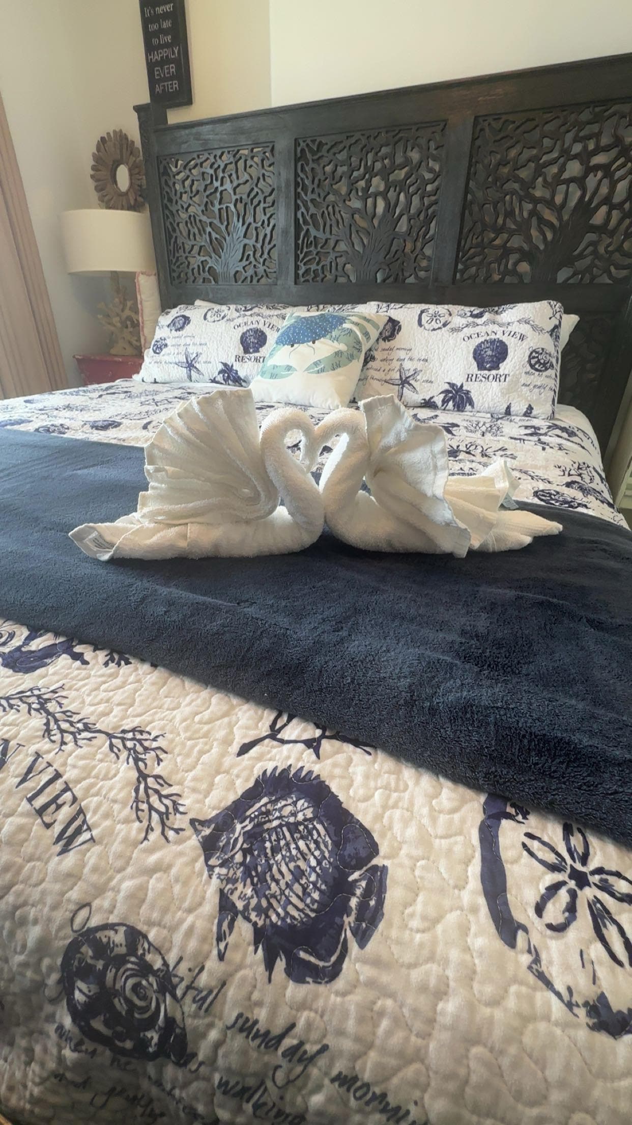 ENJOY the coastal chic decor of this beach condo getaway with 2 bedrooms and 2 full baths. An upgraded kitchen with granite countertops is fully equipped with lots of cooking utensils and serving ware. There is a Ninja Air Fryer, blender, Keurig, coffee pot, blender, toaster, and more! The Master suite offers a comfy king size bed and opens onto one of the LARGEST balconies on the beach. Awaken each morning to this amazing view. The guest bedroom has both a king size bed, a extra long twin bed and it's own large bathroom. The HUGE 286 square foot balcony has luxury patio seating and a separate bar high dining table. Assigned parking in the building avoids traffic and keeps from having to cross the street. A keyless entry allows fast and easy access. Beach chairs are included in your stay (during season)!!