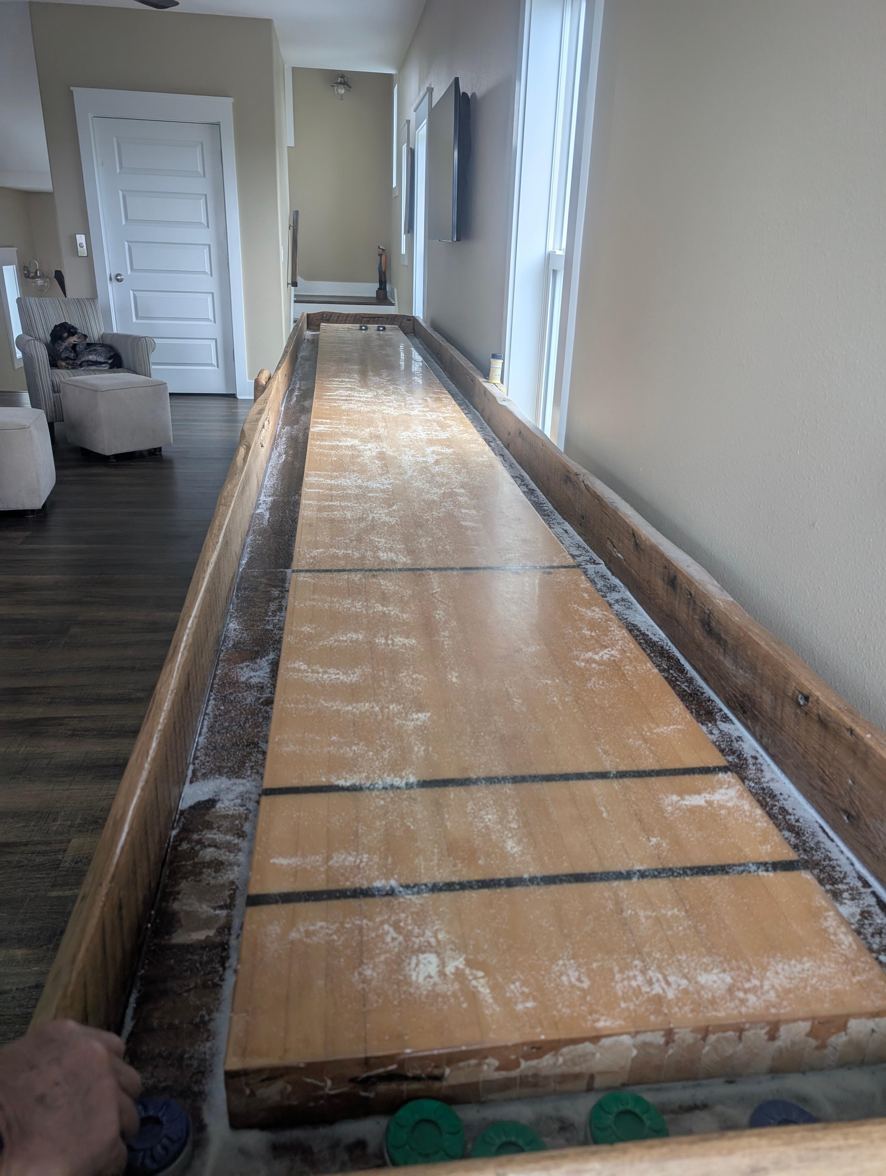 Understanding the value of shared meals, we've crafted a custom dining table from the same barn wood as the shuffleboard, seating 14 guests. It's more than a table; it's where your family will gather for meals, laughter, and memory-making.