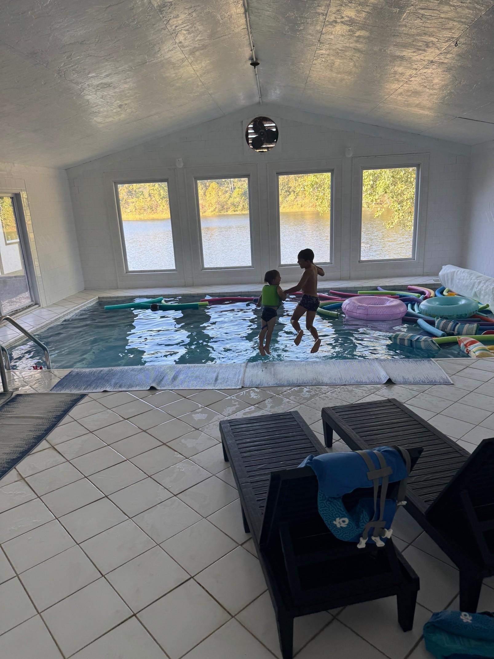 LAKEFRONT LIVING: Private indoor pool (depth 5’-7’), private lakefront beach, lakefront gazebo w/ seating, boat house, wood-burning fire pit w/ Adirondack chairs, deck w/ dining area & charcoal grills, covered furnished porch