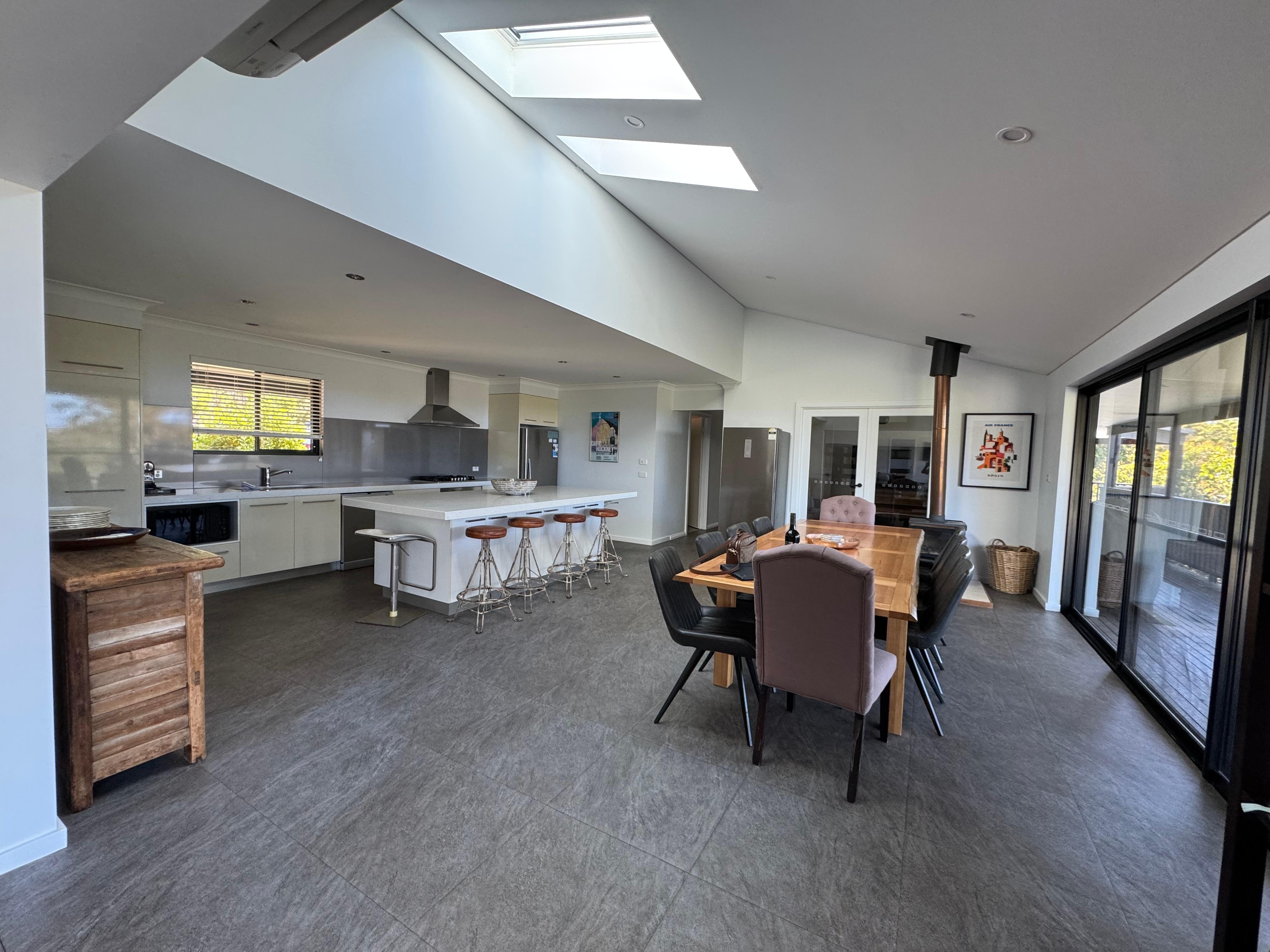 The living area features generous, plush seating perfect for gathering with the group, while the adjacent dining space comfortably hosts long, leisurely meals. A slow-combustion fireplace by the dining table and a second in the lounge add warmth and ambience during cooler months. The chef’s kitchen is fully equipped with stone benchtops, a 5-burner stainless steel cooktop, large fridge, and a Miele dishwasher, all centred around a spacious island bench perfect for family-style prep, entertaining, or morning coffee rituals.