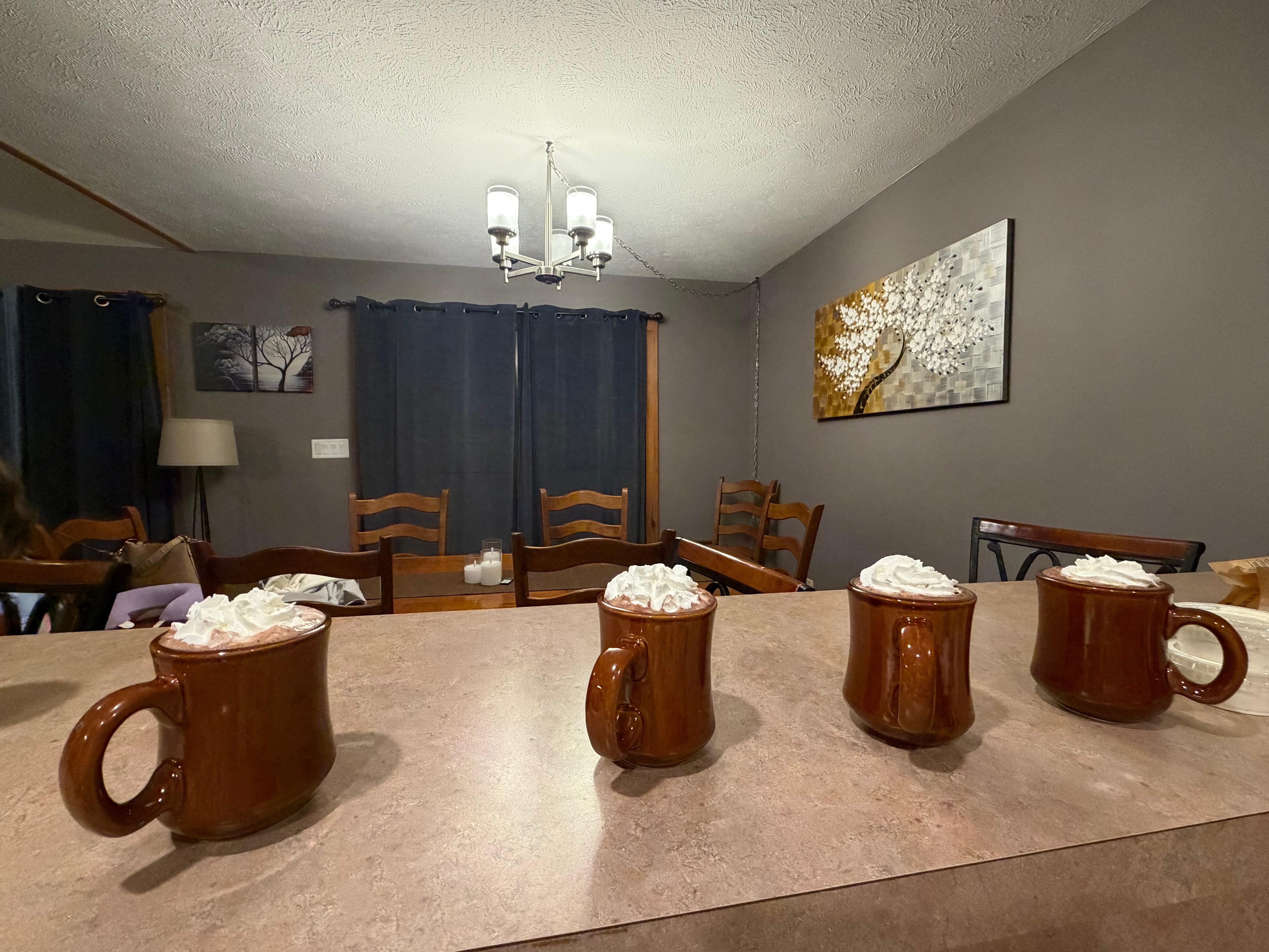 KITCHEN: Dishwasher, stove/oven, refrigerator, microwave, Keurig coffee maker, toaster, air fryer, cooking basics, trash bags + paper towels, high chair, bar seating