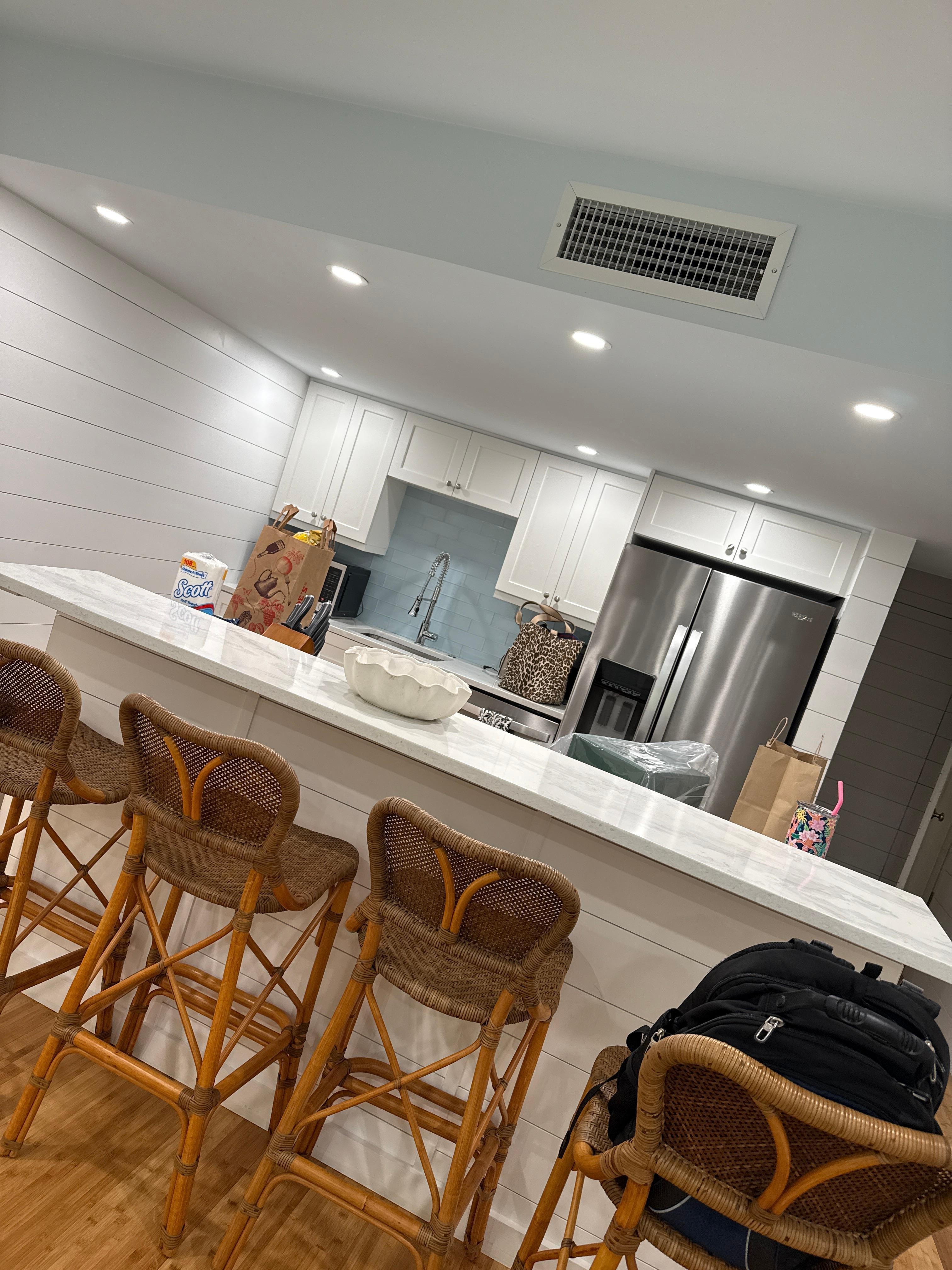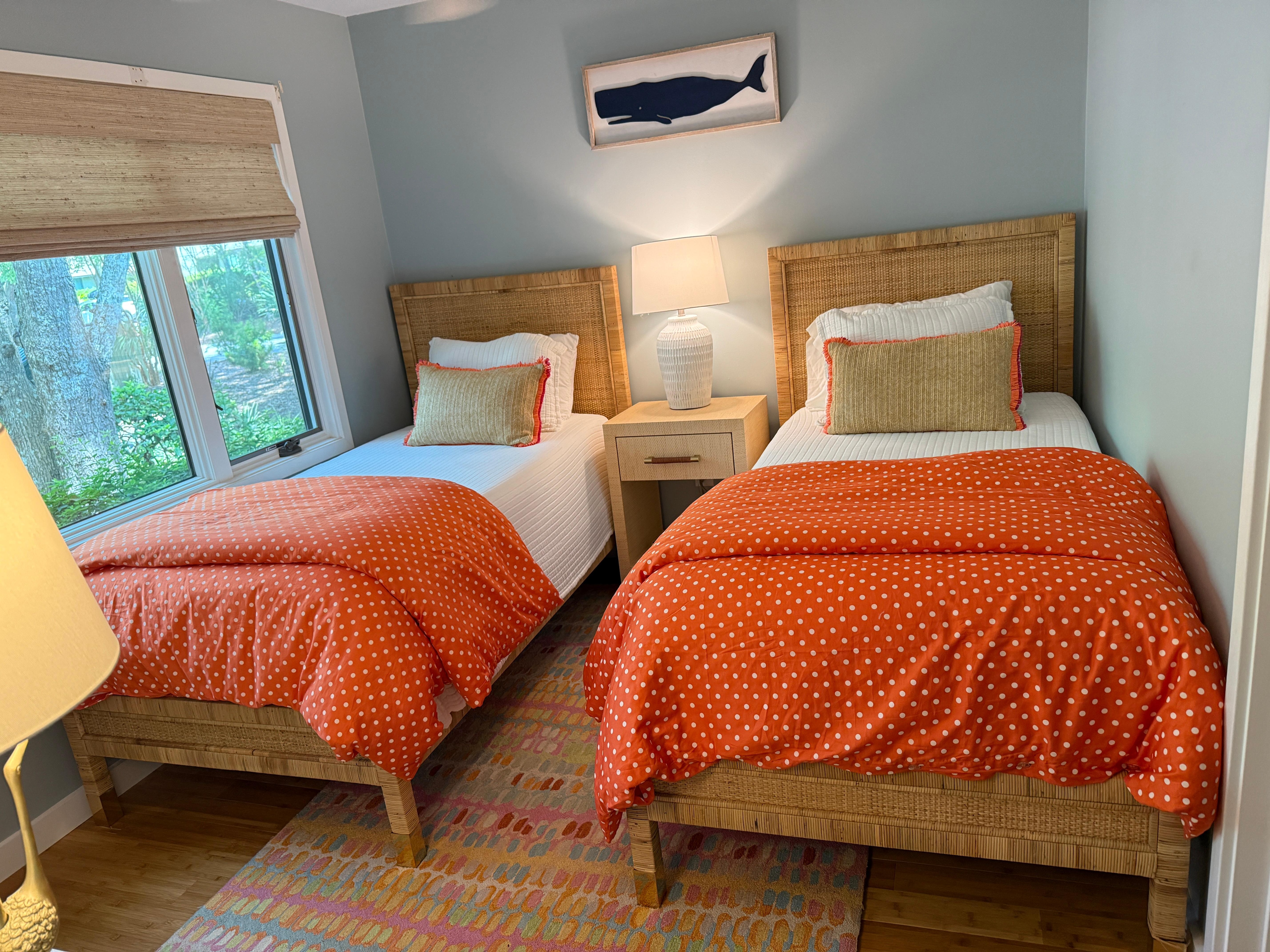 The living room offers guests ample seating and plenty of natural light. The updated kitchen provides brand new stainless steel appliances, a beautiful coastal backsplash, and seating for four.