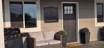 The outdoor patio has swivel chairs, a fire table and a love seat. The BBQ is available for grilling your favourite foods.