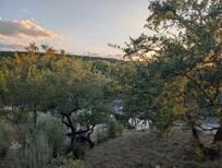 The space includes a comfortable bedroom with a king-sized bed and an attached bathroom featuring a delightful clawfoot tub with a handheld shower attachment. The living room is bathed in natural light from ample windows and offers a futon that converts into a full-sized bed, perfect for extra guests. Enjoy cozy evenings with a good book or your favorite shows on the TV. The fully equipped galley-style kitchen includes an electric range, oven, dishwasher, microwave, refrigerator, coffee maker, and bar seating for three. It’s stocked with all the basic cookware and dining utensils you’ll need. The adjacent dining area seats four and offers beautiful creek views. For added convenience, a washer and dryer are available.